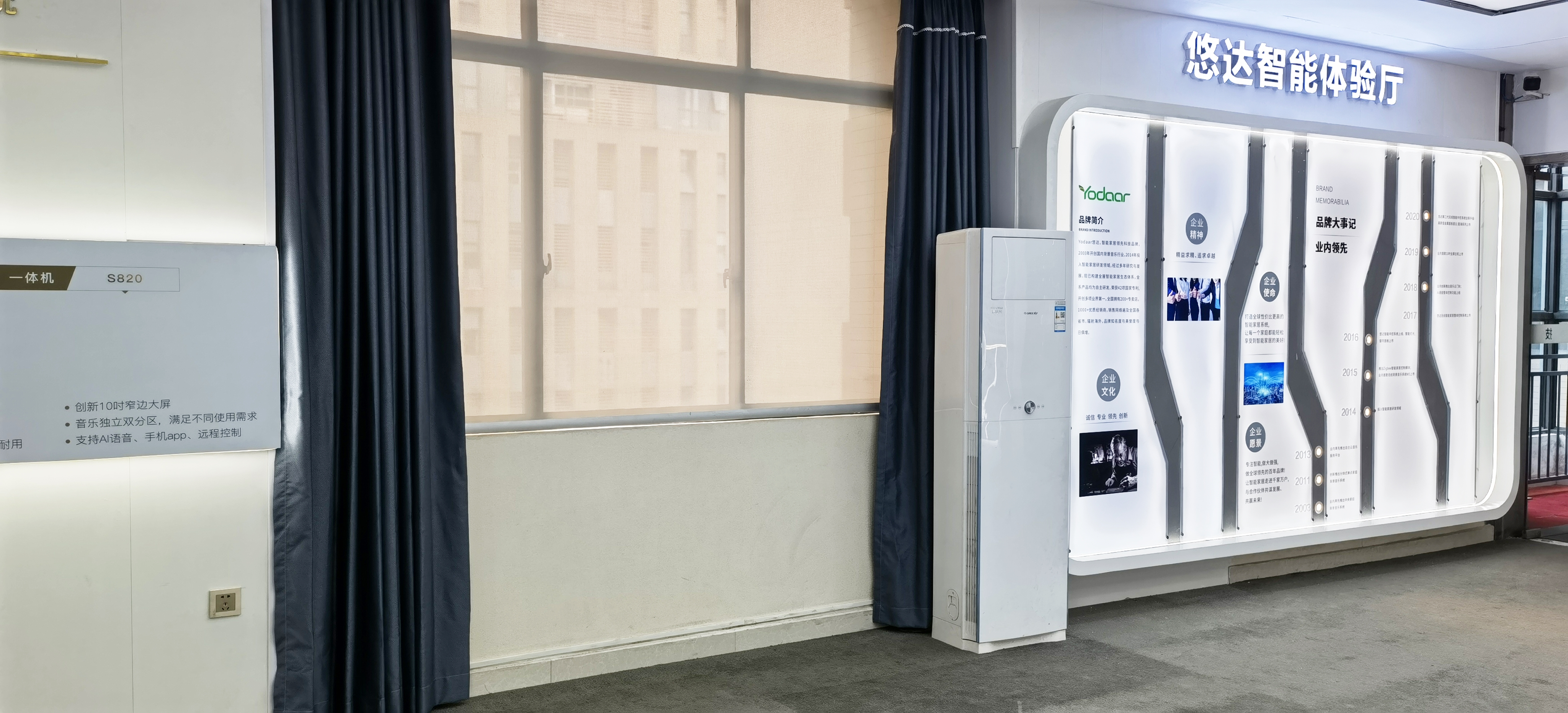 新展廳由品牌文化及產品展示區、智能家居樣板房、家庭影院三部分組成,功能齊全,能帶給客戶時尚、便捷的智能體驗。