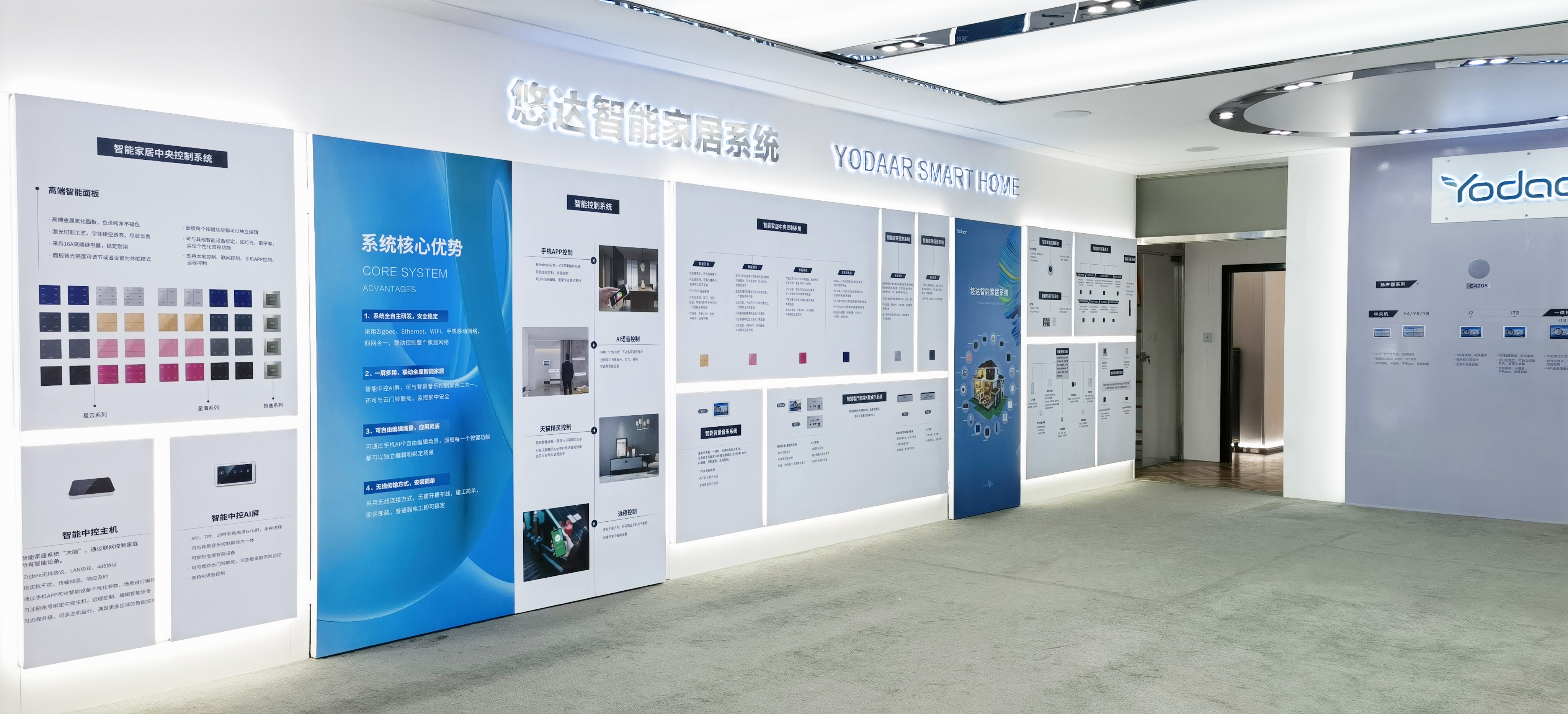 產品展示區涵蓋了悠達智能家居全系產品、不同系列背景音樂系統、圣巴赫高端智能音樂系統,不同版塊分區明確,參觀動線清晰合理,既展示出了悠達豐富齊全的產品線,也方便了客戶參觀。