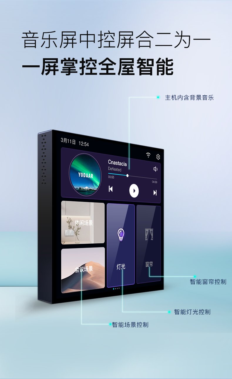 不僅如此,它還與悠達背景音樂系統深度融合,將背景音樂控制屏升級為智能中控屏后,即可輕松掌控全屋智能家居,與任意設備搭配,就是一個完整的智能家居系統,智能中控屏和智能開關面板組合,就可以實現對燈光、窗簾、背景音樂等智能設備的控制,不同智能設備如燈光、窗簾、安防等都可以根據需要靈活組建,讓你輕輕松松享受智能生活。
